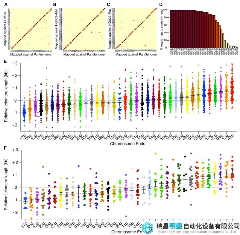 e777乐彩线路检测研究团队将150个个体的端粒序列与最近发布的泛基因组中的亚端粒序列进行了比对,将300个单倍体基因组的全基因组序列与3个高质量单倍体参考T2T基因组CHM13、HG002母基因组和HG002父基因组的序列进行比对,以确定每个参考基因组中相同亚端粒的可重复性。在所有reads中,87%在泛基因组和CHM13中定位到相同的染色体末端,90%在泛基因组和HG002母系中定位到相同的染色体末端,88%在泛基因组和HG002父系中定位到相同的染色体末端。这些数据表明,经Telomere Profiling检测的reads均可映射到一个特定的泛基因组染色体图谱,具有很高的可信度。