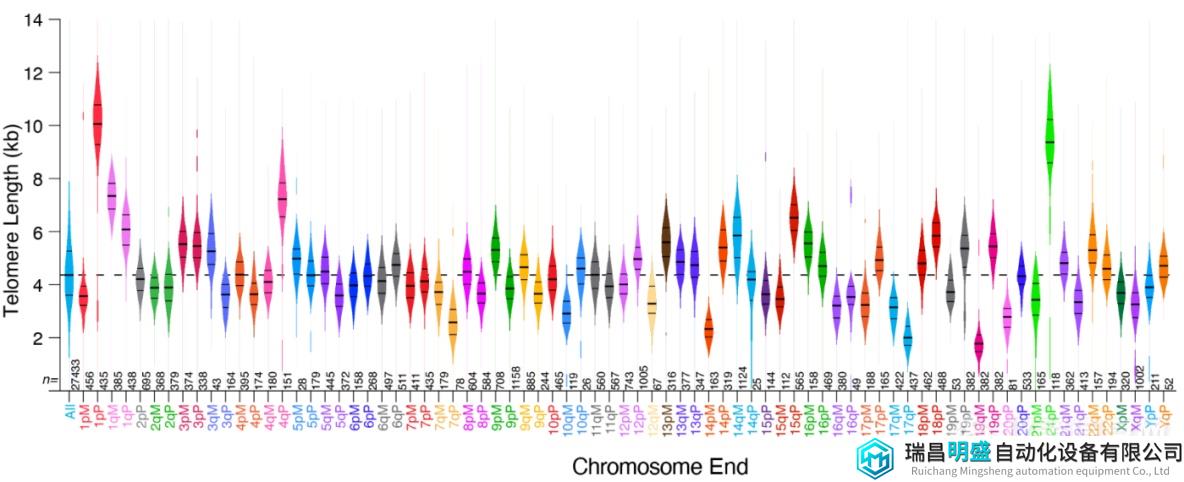 e777乐彩线路检测为确定人类是否具有染色体末端特异性端粒长度,研究团队分析了来自二倍体HG002细胞系的端粒,从HG002细胞系中分离DNA,并对端粒进行测序,将平均总长度为16.4 kb的reads映射到HG002参考基因组中,共有77个染色体末端通过质量筛选。结果显示,每条染色体的末端表现出不同的端粒长度分布;端粒中位长度为 4.7kb,有66个端粒的长度分布与均值有显著差异,平均长度差异超过6kb。除染色体末端特异性长度外,一些端粒在母系和父系单倍型之间也存在显著差异。上述结果表明,人类端粒具有染色体末端特异性长度分布。