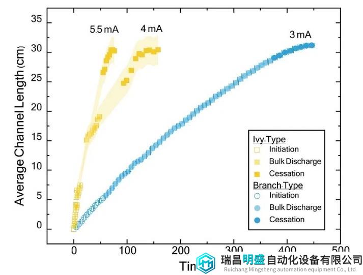 常春藤型放电模式与传统的分支型放电模式存在显著差异。通过实验观察,发现常春藤型放电的通道形成速度超过107米/秒,而分支型放电通道的形成速度为106米/秒。这一发现表明了电介质击穿过程中的不同机制及其复杂性。